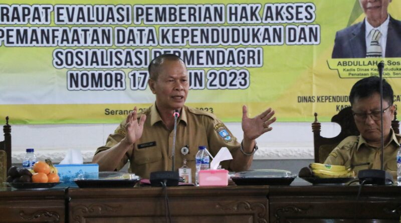 SERANG – Dinas Kependudukan dan Pencatatan Sipil (Disdukcapil) Kabupaten Serang menggelar rapat evaluasi pemberian hak akses pemanfaatan data kependudukan dan Sosialisasi Permendagri Nomor: 17 Tahun 2023 di Aula KH. Syam’un, Senin (27/11/2023).