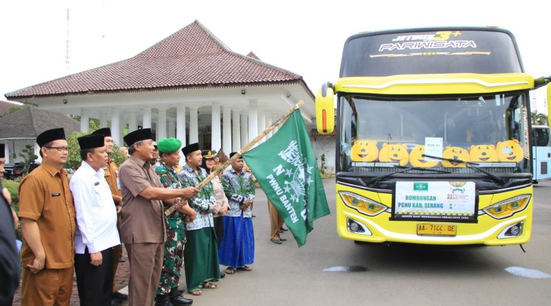 SERANG,jejakbanten.com – Wakil Bupati (Wabup) Serang Pandji Tirtayasa melepas ratusan warga Kabupaten Serang untuk menghadiri Puncak Hari Lahir (Harlah) 1 Abad Nahdlatul Ulama (NU) di Halaman Pendopo Bupati Serang pada Senin (6/2/2023). Ratusan orang itu akan menuju lokasi puncak Harlah NU di Gelora Delta, Sidoarjo, Jawa Timur (Jatim).