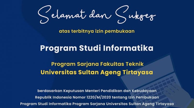 SERANG, jejakbanten.com – Universitas Sultan Ageng Tirtayasa (Untirta) diawal tahun ini memiliki program studi baru, yakni prodi Informatika yang berada di Fakultas Teknik.